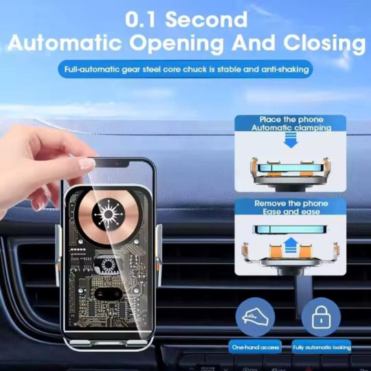 C10 Kvalitní hliníková bezdrátová inteligentní nabíječka do auta s optickým senzorem pro automatické rozevření při vkládání telefonu a dotykovým senzorem pro otevření držáku při vyjmutí. Vybavená je držákem s kloubovou aretací pro uchycení do ventilace.