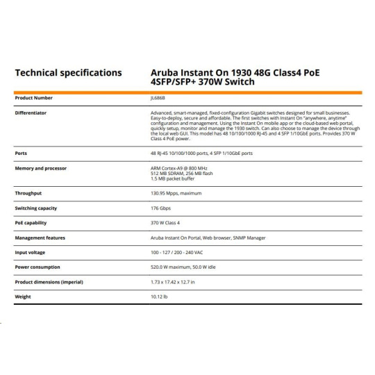 | Aruba Instant On 1930 48G Class4 PoE 4SFP/SFP+ 370W Switch (JL686B) | ||