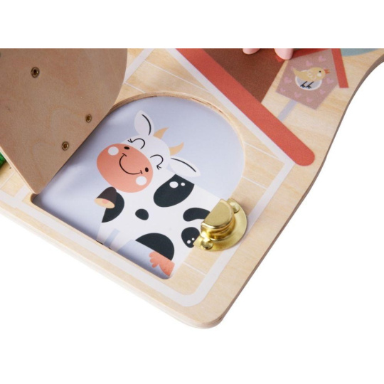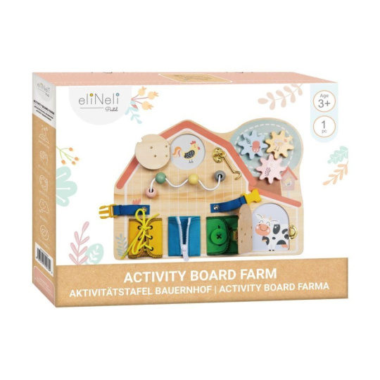 Activity board v podobě farmy zavede holčičky i chlapce na venkov, kde si pohrají s hracími prvky a osvojí si pár praktických dovedností. Activity board s ozubenými koly, korálkovým bludištěm, dvířky a okýnkem, různými zámky a různými způsoby zapínání vede děti k samostatnosti ve hře, v poznávání a učení se, v oblékání..