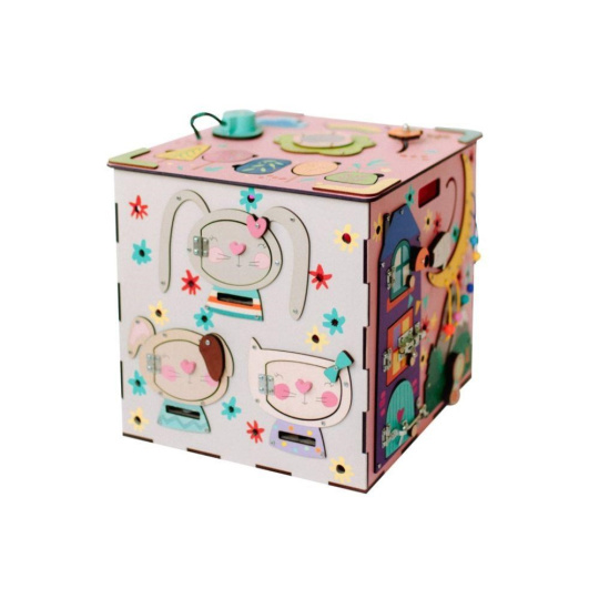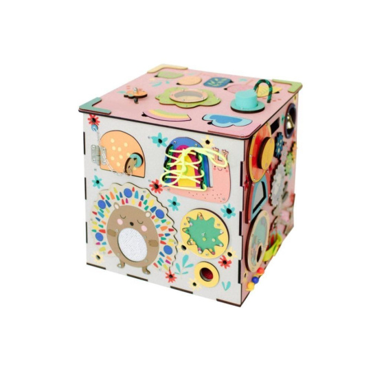 Activity board kostka s LED osvětlením XXL je originální montessori hračkou, která děti zabaví, zdokonalí jejich schopnosti a naučí je novým dovednostem. Každá strana růžového activity boardu je originální a nabízí nespočet možností ke hře, zkoumání a poznávání. Nechybí ozubená kola a kolečka, různé způsoby zapínání, tkanička, různé způsoby zavírání, korálky, bludiště, vkládací puzzle, různá překvapení i sluníčkový vypínač, který activity board kostku rozzáří..
