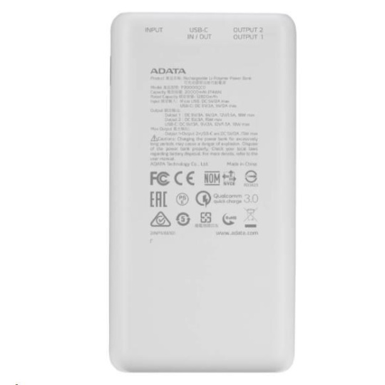 ADATA PowerBank P20000QCD - externí baterie pro mobil/tablet 20000mAh, 2,1A, bílá (74Wh)