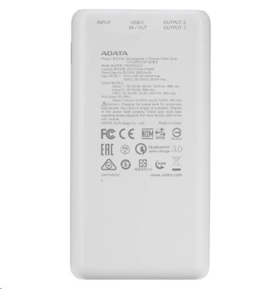 ADATA PowerBank P20000QCD - externí baterie pro mobil/tablet 20000mAh, 2,1A, bílá (74Wh)