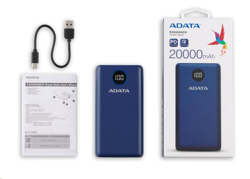 ADATA PowerBank P20000QCD - externí baterie pro mobil/tablet 20000mAh, 2,1A, modrá (74Wh)
