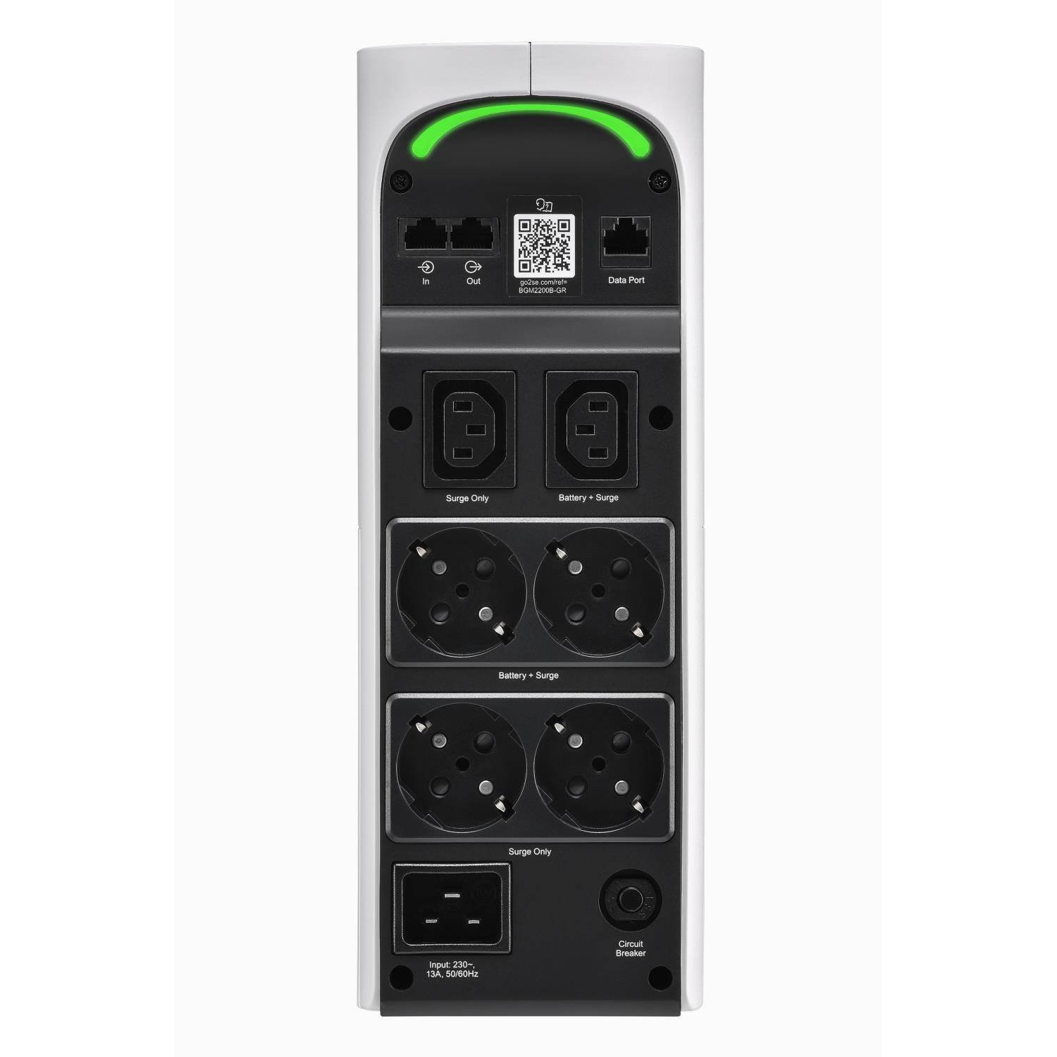 Věžová UPS 2200VA/1320W má celkem 6 zásuvek, z nichž 3 jsou záložní baterie a přepěťová ochrana a 3 jsou pouze přepěťovou ochranou. Má nárazovou energii 1080 joulů. Je vybavena automatickou regulací napětí, která koriguje poklesy a rázy napětí na správnou úroveň. Dodává se s PowerChute Serial Shutdown, snadno použitelným softwarem pro bezpečné vypnutí systému s funkcemi správy napájení a energie. Tato UPS má 3letou záruku a politiku ochrany připojeného zařízení ve výši 150 000 USD. Má 2 USB porty (Typ A + C) pro chytré nabíjení osobních zařízení.