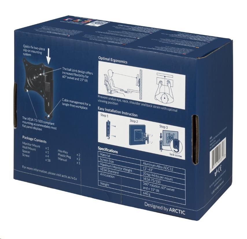 The ARCTIC W1A is a single pivot 3 axis articulation bracket mount, offers smooth adjustable screen angle with 360° rotation, 60° swivel and ±15°tilt. The ball joint design gives the flexibility to perfectly position your monitor to reduce eye, neck, shoulder and back strain. It mounts closely to the wall and maximise your work area. Compatible with monitors from 13" to 43", the two-piece direct mounting system allows quick installation and support up to 20 kg in weight.