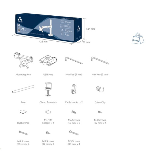 ARCTIC stolní držák Z1 (Gen.3) pro 1x LCD do 43", nosnost 15kg, USB HUB, černý (black)