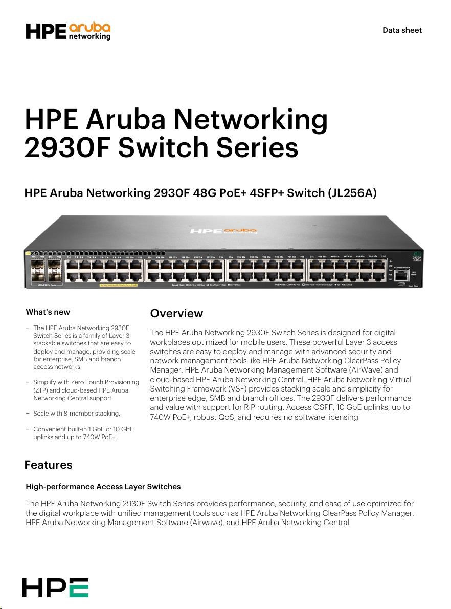 Aruba 2930F 48G PoE+ 4SFP+ Swch RENEW JL256A