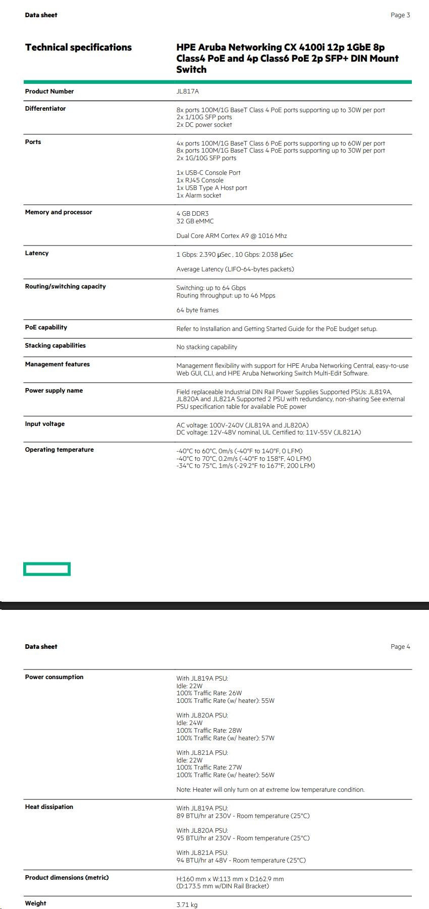 Aruba 4100i 12-port 1GbE (8-port Class 4 POE and 4-port Class 6 POE) 2-port SFP+ DIN Mount Switch (JL817A)