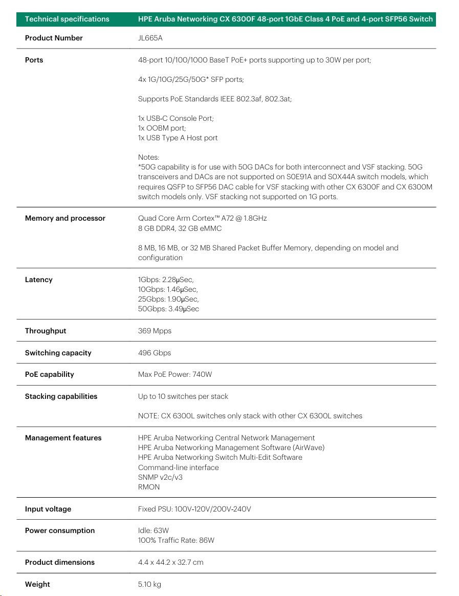 Aruba 6300F 48-port 1GbE Class 4 PoE and 4-port SFP56 Switch (JL665A)