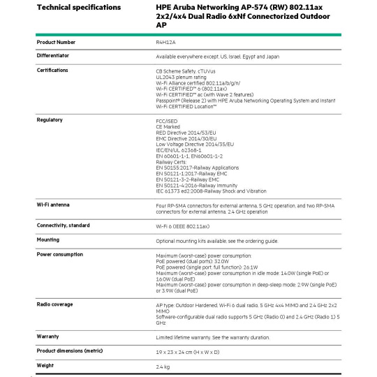 Aruba AP-574 (RW) 802.11ax 2x2:2/4x4:4 Dual Radio 6xNf Connectorized Outdoor AP R4H12A RENEW.