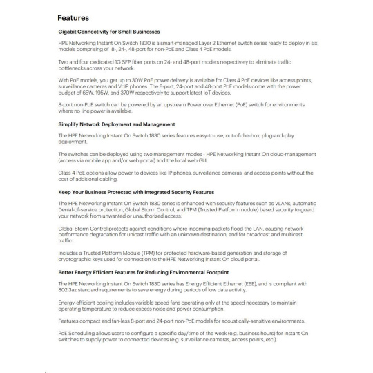 | Aruba Instant On 1830 8G Switch (JL810A) | Aruba Instant On 1830 8G 4p Class4 PoE 65W Switch (JL811A) | Aruba Instant On 1830 24G 2SFP Switch (JL812A) | Aruba Instant On 1830 24G 12p Class4 PoE 2SFP 195W Switch (JL813A) | Aruba Instant On 1830 48G 4SFP Switch (JL814A) | Aruba Instant On 1830 48G 24p Class4 PoE 4SFP 370W Switch (JL815A) | ||||