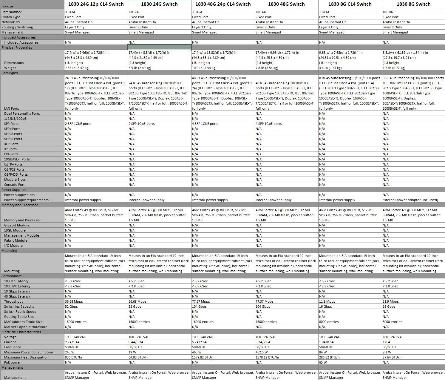 Notes: 1Acoustics measured in 23°C semi-anechoic chamber with a loading of 100% traffic and (for JL813A and JL815A) 50% PoE on all ports. Measured in accordance with ISO 7779. Declared in accordance with ECMA-109:2010. Values presented are the Declared A-Weighted Sound Power Level (LWAd) and the mean Bystander A-Weighted Sound Pressure Level (LpAm)
