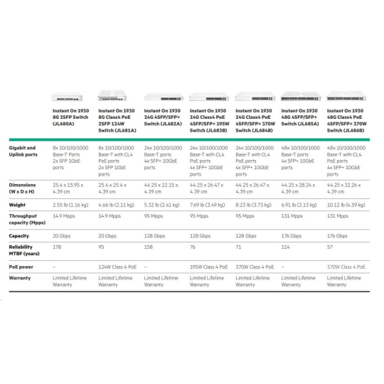 | The Instant On Differentiators Easy Setup and Management The Aruba Instant On mobile app allows you to set up, manage, and monitor Instant On switches and access points directly from your phone. Within the app, you get guided step-by-step instructions to install Instant On devices to get your network up and running quickly - no technical expertise required. And cloud-based access allows you to access the network from anywhere, at any time. Non-intrusive, Aesthetic Design Aruba Instant On switches are designed to complement the sleek and clean look of the Instant On access points, and to blend discreetly into your site's environment. The 8-port models, as well as the 24- and 48-port non PoE models, are fan-less, making them ideal for quiet office deployments. High Performance with Flexible Options The series consists of four (4) Class 4 PoE switches, and three (3) non-PoE switches including 8- 24- and 48-port Gigabit Ethernet switches. The two (2) dedicated 1G SFP fiber ports on 8-port models, and four (4) dedicated 1G/10G SFP+ fiber ports on 24-/48-port models, ensure high performance and eliminate traffic bottlenecks across the network. Customizable features include basic Layer 2 features like VLANs and link aggregation, as well as advanced features such as Layer 3 IPv4 static routing, ACLs, and Spanning Tree Protocols, and IPv6 Host mode. Optimized User Experience The Aruba Instant On mobile app provides common workflows for Instant On switches and access points making it easier to configure, monitor and manage your network remotely without the need for additional hardware like cloud keys or VPN. You can also update firmware on your Instant On devices directly from the cloud whenever you want, from wherever you are. Site inventory The site inventory feature on the Instant On mobile app shows you all switches and AP's on a single screen, allowing you to quickly identify non-functioning devices and troubleshoot accordingly. Multi-Site Management The cloud-hosted web interface and mobile app make it easy to manage multiple sites, multiple networks, distributed deployments and multi-tenant deployments. Each site is logically separated and has its own configuration, statistics, guest portal, and admin read/write privileges. Built-In Security Built-in security features protect your network from external threats by blocking malware attacks and keeping unauthorized users off the network. Network traffic can be filtered and access restricted based on MAC and IP address. No Hidden Fees All features are included in the price of the hardware - there are no recurring subscription or licensing fees. Expert-level support and industry leading limited lifetime warranty are also included, along with chat support for the life of the product. |