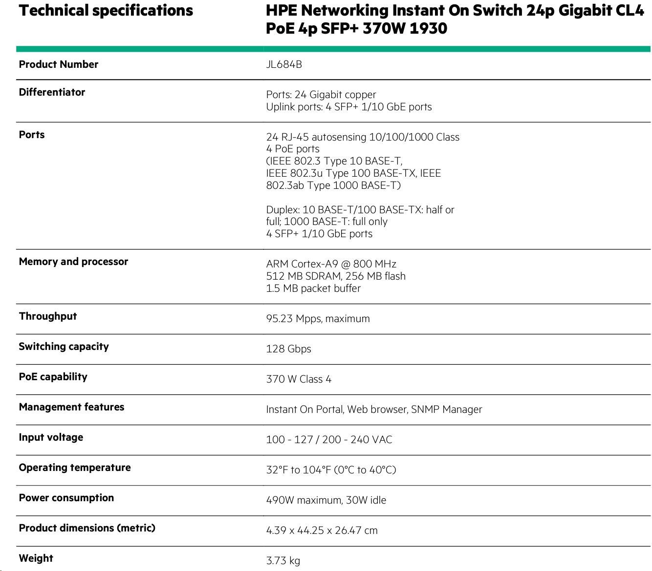 Aruba Instant On 1930 24G Class4 PoE 4SFP/SFP+ 370W Switch (JL684B)