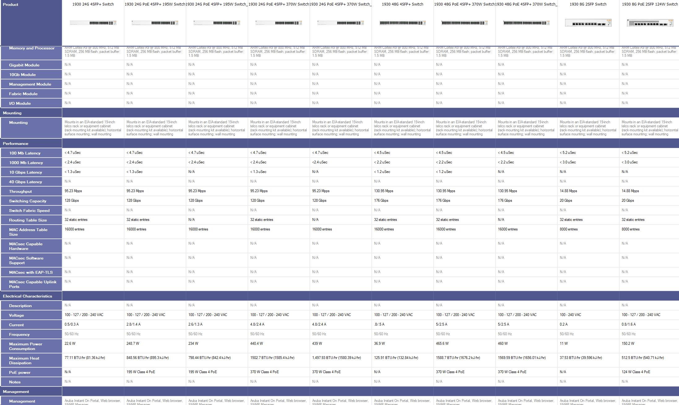 | Transceivers | Aruba Instant On 1G SFP LC SX 500m OM2 MMF Transceiver (R9D16A ) Aruba 1G SFP LC LX 10km SMF Transceiver (J4859D) Aruba Instant On 1G SFP RJ45 T 100m Cat5e Transceiver (R9D17A) Aruba Instant On 10G SFP+ LC SR 300m OM3 MMF Transceiver (R9D18A) Aruba 10G SFP+ LC LR 10km SMF Transceiver (J9151E) | |