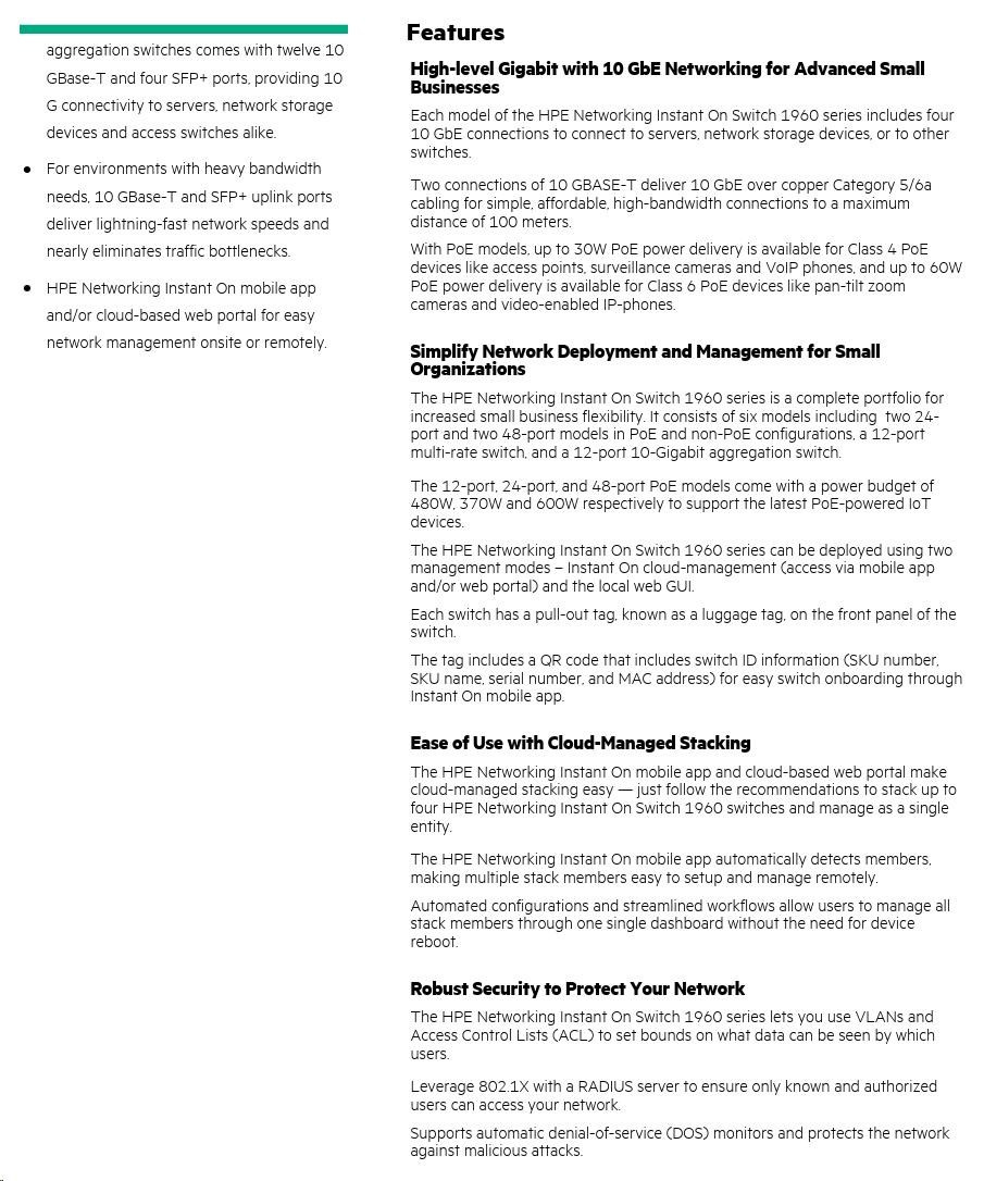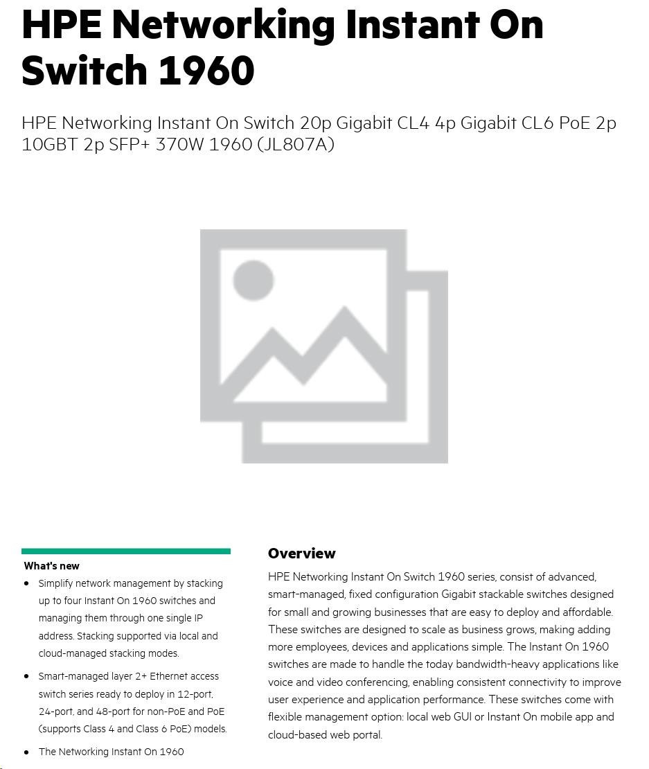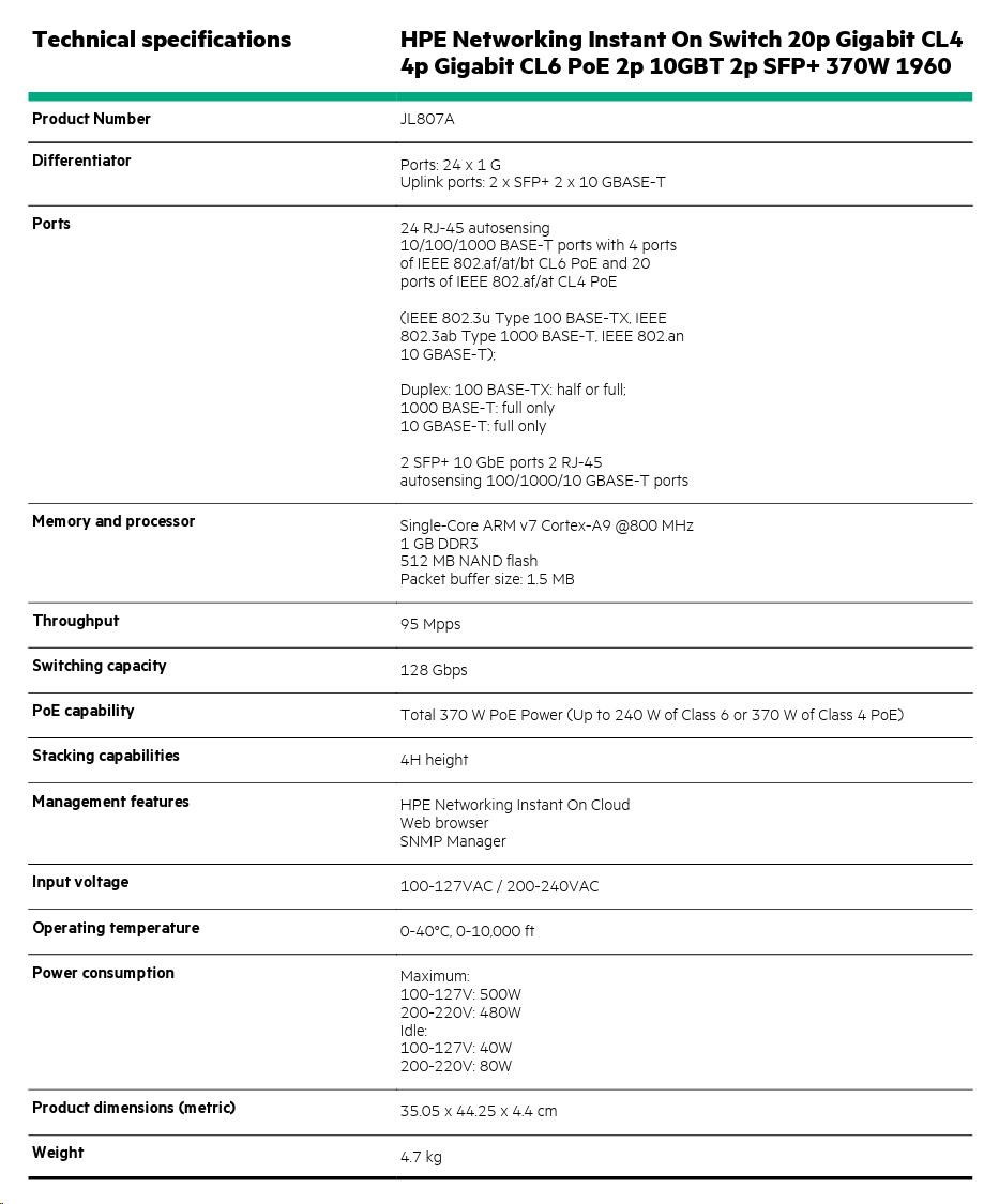 HPE Networking Instant On Switch 20p Gigabit CL4 4p Gigabit CL6 PoE 2p 10GBT 2p SFP+ 370W 1960 (JL807A)