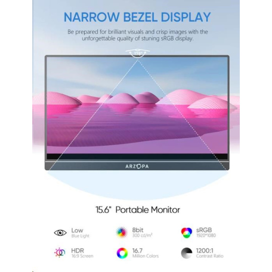 A1 je nejen praktické zařízení, ale také zařízení pro pohodlí. Přenosný monitor Arzopa bude ideální pro hraní her, studium, sledování filmů nebo práci. Díky jeho lehké konstrukci si jej budete moci snadno vzít s sebou na jakýkoli výlet! Užijte si vynikající kvalitu obrazu, ať jste kdekoli!