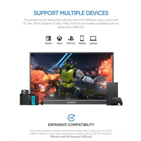 Arzopa Z1RC je přenosný monitor, který kombinuje vynikající kvalitu obrazu s kompaktním designem. Jeho 16" obrazovka nabízí rozlišení 2560 x 1600 p s obnovovací frekvencí 60 Hz, díky čemuž si můžete vychutnat dynamický obraz s bohatými detaily. Je kompatibilní se širokou škálou zařízení a díky možnosti zobrazovat obraz na výšku i na šířku jej přizpůsobíte svým preferencím. Snadno se vám vejde do tašky nebo batohu a poskytne vám možnost pracovat nebo se bavit kdekoli.