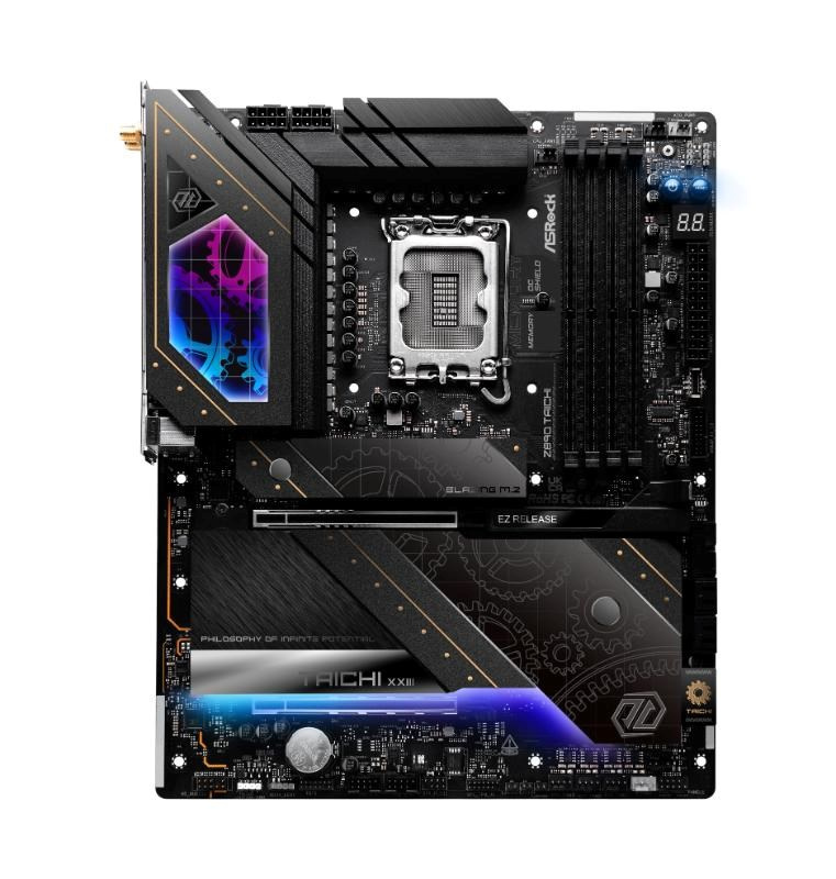 Taichi series flagship motherboard features top-tier hardware spec, robust power design, Thunderbolt™ 4 Type-C, and DIY-friendly functionality. It's built for high-end gamers, offering luxury aesthetics and powerful performance.