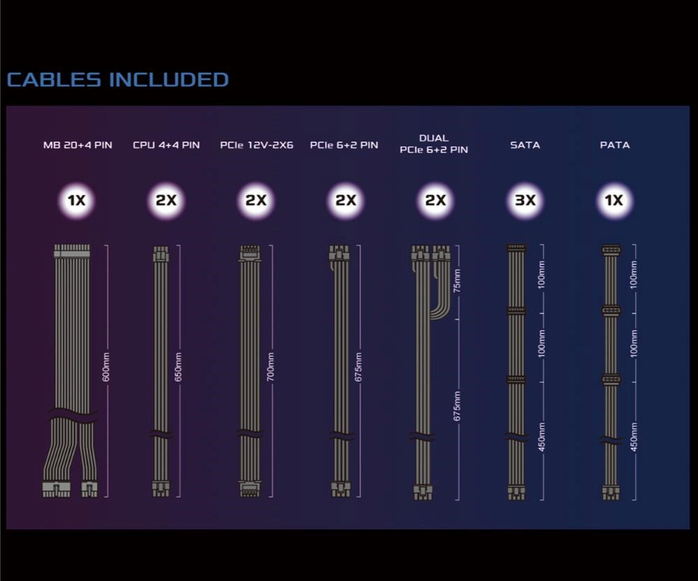 | Dueal PCIe 6+2 Pin Konektor | 2x / 2x (675 + 75 mm) |