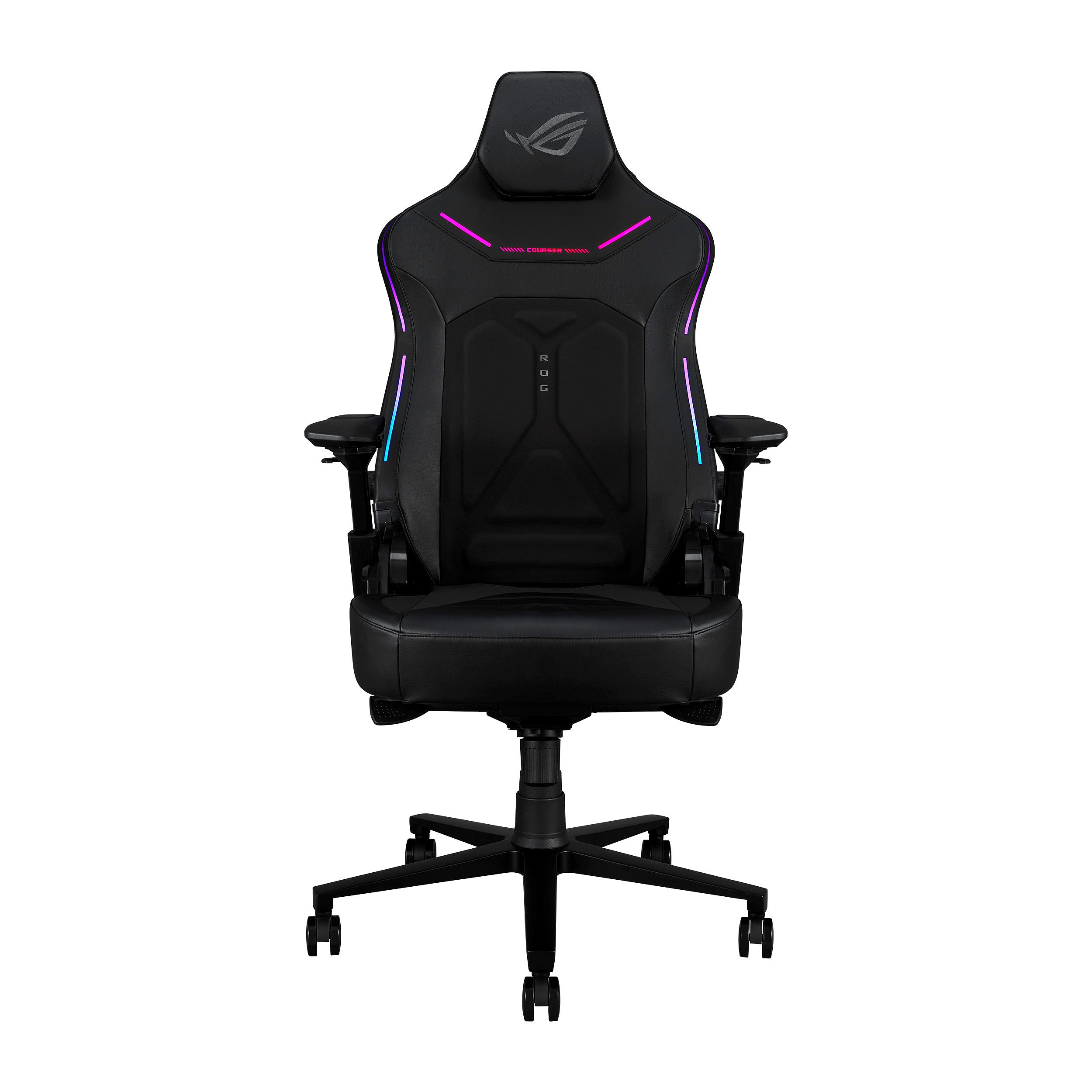 Herní židle ROG Courser s nastavitelnou bederní opěrkou lisovanou za studena pro podporu a proudění vzduchu, 4D područkami, ultraširokým sedákem, magnetickou opěrkou hlavy, dynamickým synchronizovaným systémem sklápění a osvětlením Aura RGB