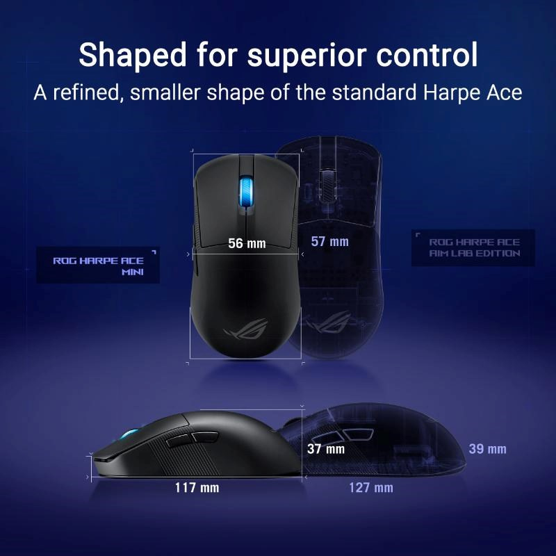 ROG Harpe Ace Mini je ultralehká 49gramová polosymetrická herní myš s tvarem schváleným profesionálními hráči FPS. ROG Harpe Ace Mini je vybaven optickým senzorem ROG AimPoint Pro s rozlišením 42 000 dpi a optickými mikropřepínači ROG a zobrazuje špičkový bezdrátový výkon s bezdrátovou technologií SpeedNova a podporuje až 8 000 Hz bezdrátovou rychlost dotazování (kompatibilní s ROG Polling Rate Booster).