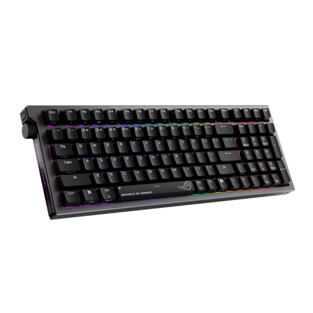 ROG Strix Morph 96 Wireless: Custom herní klávesnice s mechanickými spínači ROG NX V2 s funkcí hot-swap, PCB s orientací na jih (south-facing), připojením ve třech režimech, bezdrátovou technologií ROG SpeedNova, konstrukcí gasket mount s tlumicími vrstvami, třemi nastavitelnými úhly náklonu, odolnými ROG doubleshot ABS klávesami a podporou MacOS.