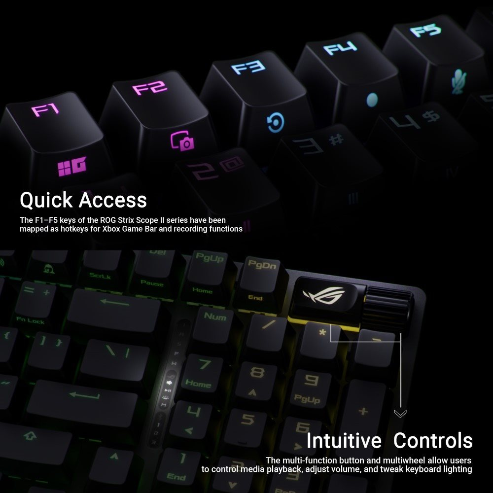 Bezdrátová herní klávesnice ROG Strix Scope II 96 s připojením ve třech režimech, klávesové zkratky pro streamování, multifunkční ovládací prvky, mechanické spínače ROG NX s možností výměny za provozu, stabilizátory klávesnice ROG, krytky kláves PBT doubleshot a silikonová tlumicí pěna, tři úhly sklonu a opěrka zápěstí