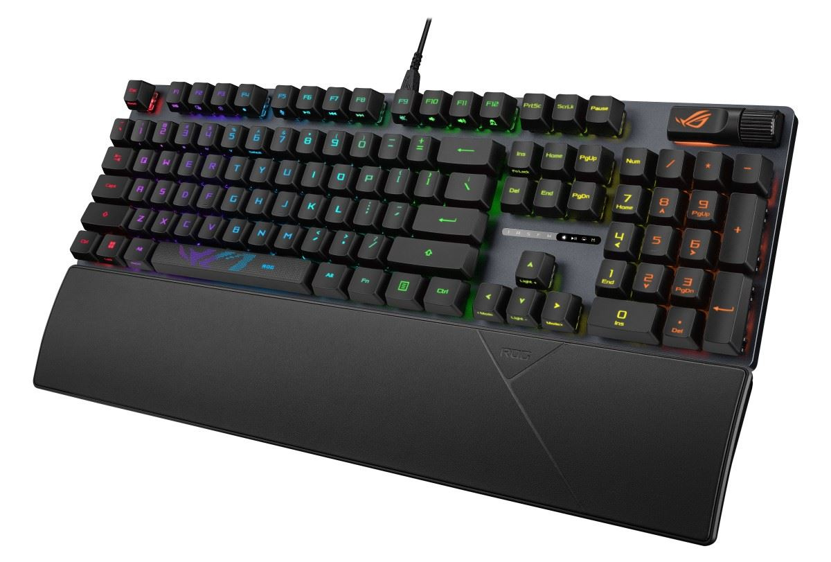 Herní klávesnice ROG Strix Scope II s předem namazanými mechanickými spínači ROG NX Red, pěnou tlumící zvuk, dvojitými krytkami kláves PBT nebo ABS s UV povlakem, klávesovými zkratkami pro streamování, multifunkčními ovládacími prvky, třemi úhly sklonu a opěrkou zápěstí