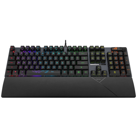 Herní klávesnice ROG Strix Scope II s předem namazanými mechanickými spínači ROG NX Snow a NX Storm, pěnou tlumící zvuk, dvojitými krytkami kláves PBT nebo ABS s UV povlakem, klávesovými zkratkami pro streamování, multifunkčními ovládacími prvky, třemi úhly sklonu a opěrkou zápěstí