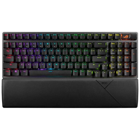Herní klávesnice ROG Strix Scope II X s mechanickými spínači ROG NX V2 s možností výměny za provozu, pěnovým tlumením zvuku, zdvojenými klávesami PBT nebo ABS s UV povlakem, streamovacími klávesami, multifunkčními ovládacími prvky, třemi úhly sklonu a opěrkou zápěstí.