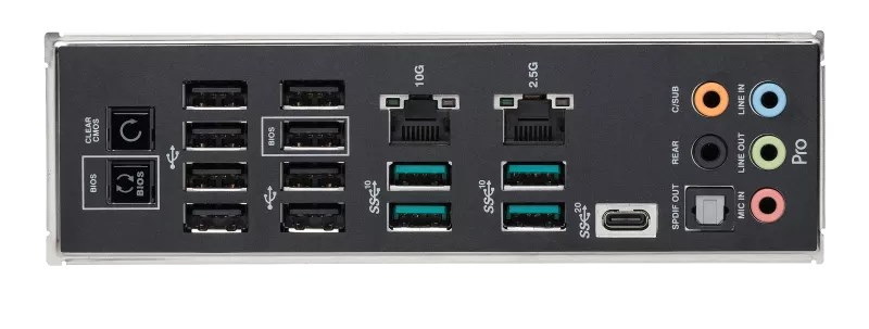 1 x USB 3.2 Gen 2x2 port(s) (1 x USB Type-C®) 4 x USB 3.2 Gen 2 port(s) (4 x Type-A) 8 x USB 2.0 port(s) (8 x Type-A) 1 x Marvell® AQtion 10Gb Ethernet port 1 x Intel® 2.5Gb Ethernet port 5 x Audio jacks 1 x Optical S/PDIF out port 1 x BIOS FlashBack™ button 1 x Clear CMOS button