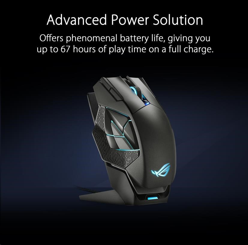 - Advanced Power Solution - ROG Spatha X offers phenomenal battery life, giving you up to 67 hours of play time on a full charge. And if the battery does run low, just 15 minutes of charging via USB-C or the charging dock provides up to 12 hours* of intense wireless gaming.