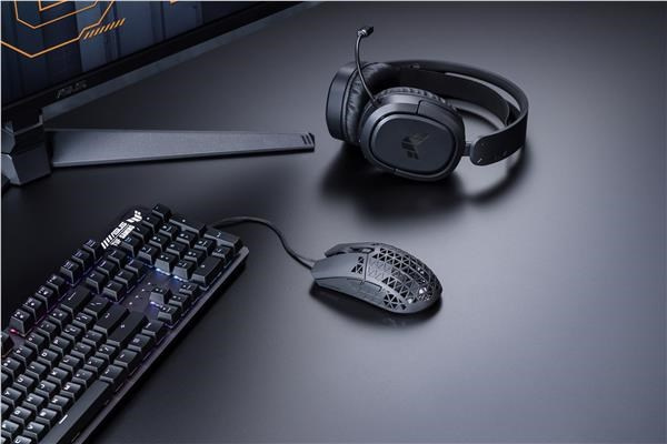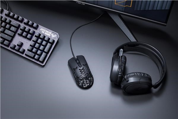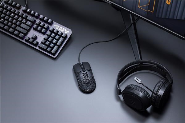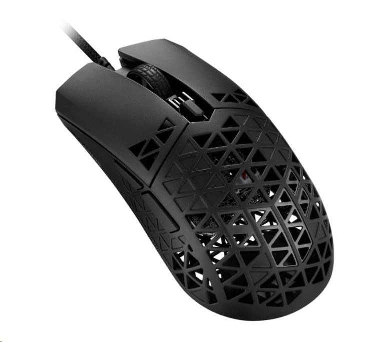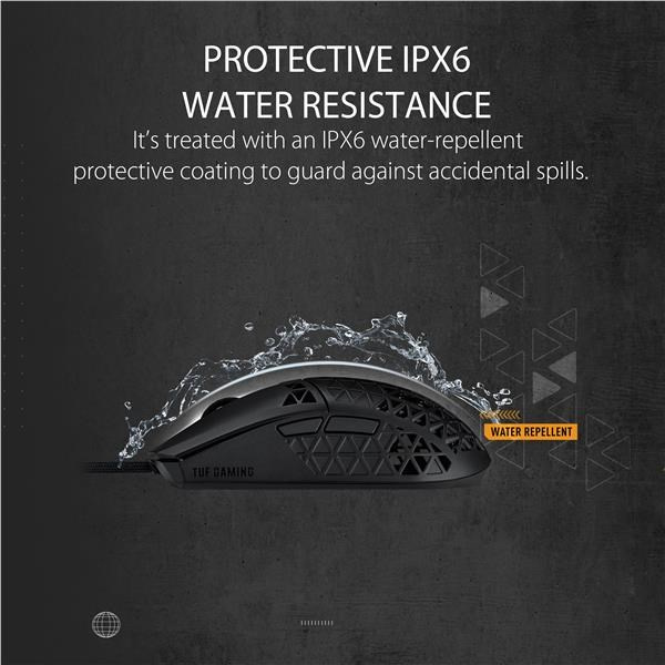 A lightweight wired gaming mouse with 16,000 dpi sensor, six programmable buttons, ultralight Air Shell, IPX6 water resistance , ASUS Antibacterial Guard, TUF Gaming Paracord and pure PTFE feet