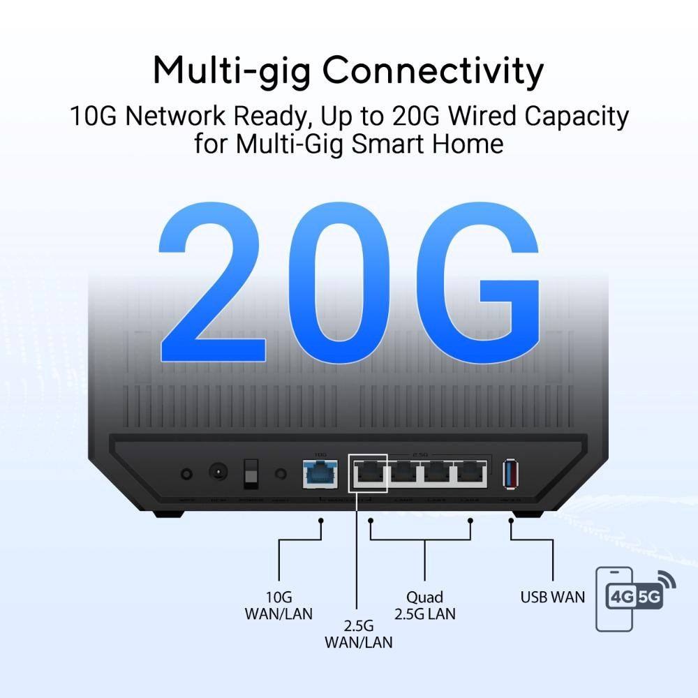 | I/O Porty | 1x 10Gbps WAN/LAN port 1x 2.5Gbps WAN/LAN port 3x 2.5Gbps LAN port 1x USB 3.2 |