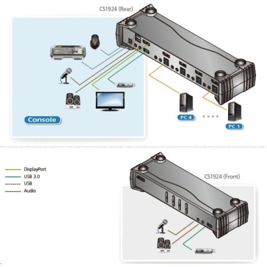 Aten CS1924 4-port 4K DisplayPort KVMP 3.0 přepínač umožní jednomu uživateli sdílet čtyři připojené počítače za pomocí jedné klávesnice, myši a monitoru.
