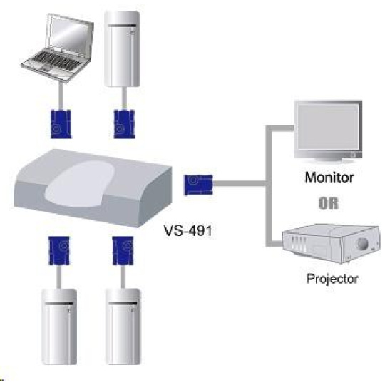 Video elektronický přepínač 4 PC - 1 VGA VS-491 - výběr zdroje signálu pomocí tlačítka - rozlišení až 1920x1440 - VGA, SVGA, Multisync - zesiluje VGA signál - power save mod při vypnutém PC - až 10m vzdálenost kabelů bez ztráty kvality signálu - aktivní prvek, včetně napájecího adaptéru - DDC, DDC2, DDC2B Compatible. Konektory: - vstup 15pin HDB 4x Female - výstup 15pin HDB 1x Female - váha 220g - rozměry 120x65x64mm.