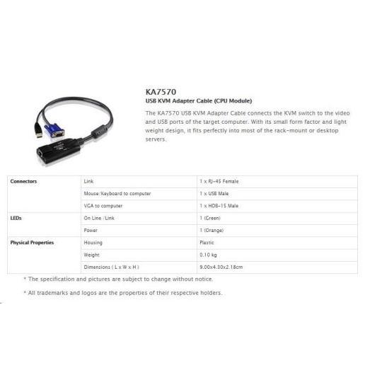 | Konektory | USB samec typ A 1x VGA samec 1x 1x RJ-45 pro připojení do KVM |