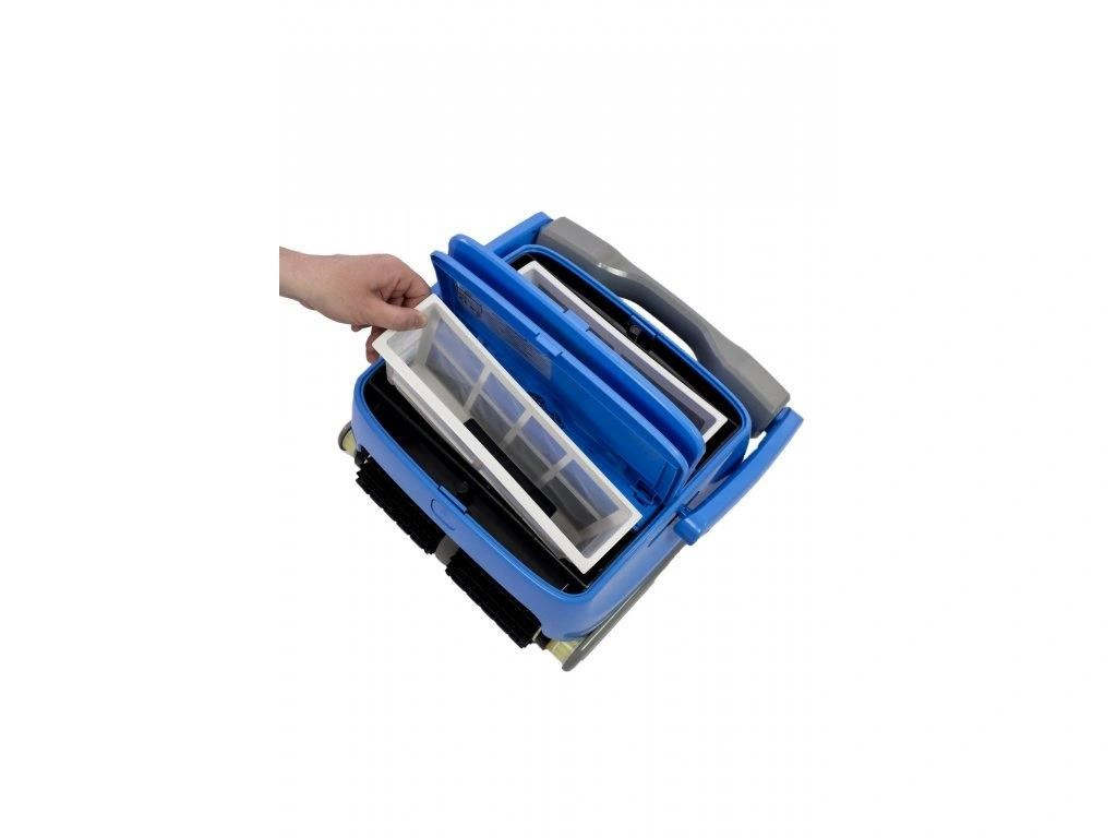 Vysavač se pohybuje po gumových pásech, které se hodí do bazénů všech povrchů. Masivní 30cm velké kartáče v přední a zádní části systematicky uvolňují nečistoty ulpívající na dně a stěnách bazénu, které jsou poté nasávány centrálním motorem do 2 filtračních kazet (košů).