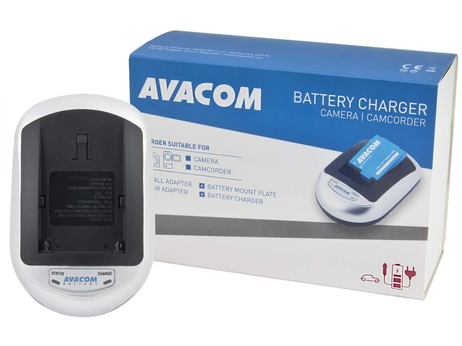 Balení obsahuje: nabíjecí základnu, redukci AVP, síťový adaptér na 100 - 240V, 12V autoadaptér do zapalovače, návod k použití.
