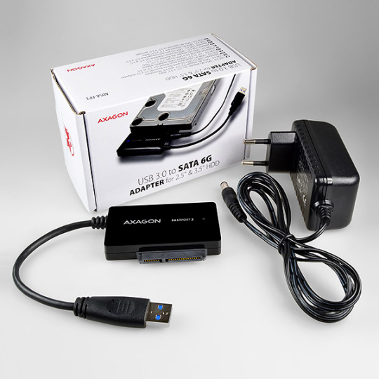 • USB 3.0 - SATA 6G adaptér vč. USB 3.0 kabelu délky 12 cm a napájecí adapter 100-240V / 12V-2A.