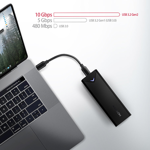 Díky USB 3.2 Gen 2 rozhraní je přenosová rychlost až 10 Gb/s. Externí M.2 box podporuje i další moderní funkce např. UASP, TRIM a umožňuje čtení S.M.A.R.T. informací monitorujících stav disku. Podpora úsporného režimu při nečinnosti.