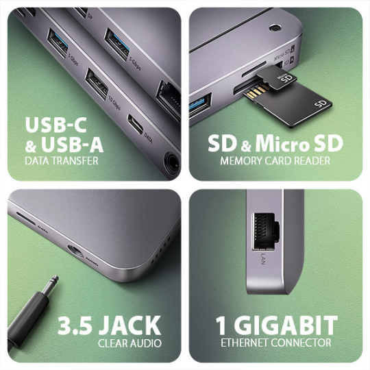 Multiportový USB-C 10Gbps hub AXAGON HMC-12GM2 GEN2COMBO 12in1 rozšíří Váš notebook, počítač nebo telefon o jedenáct portů a externí box pro M.2 disk. Přes oboustranný USB-C konektor snadno a rychle připojíte k počítači až dva monitory, čtyři USB zařízení, Gigabitovou ethernet síť, sluchátka, čtečku SD karet a NVMe nebo SATA M.2 SSD disk. Zároveň získáte možnost napájení notebooku pomocí technologie Power Delivery. USB-C hub vám tak poskytne jednoduchou a skladnou dokovací stanici 12v1 k notebooku jako je například Apple MacBook Air nebo Pro.