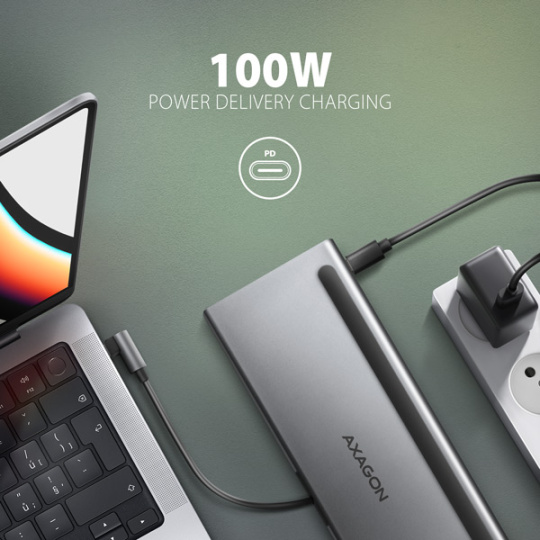USB-C konektor je vyhrazen pouze pro napájení a současné dobíjení notebooků pomocí technologie Power Delivery 3.0 výkonem až 100W. Do hubu zapojíte USB-C Power Delivery nabíječku a hub připojíte k notebooku. Tím také uvolníte jeden USB-C port. Podmínkou je notebook s podporou nabíjení z USB-C portu pomocí Power Delivery a vhodná PD nabíječka.