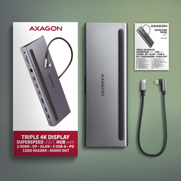 AXAGON HMC-4KX3 USB 5Gbps hub, 3x USB-A, 2x HDMI, DP, RJ-45 GLAN, SD/microSD, audio, PD 100W, kabel USB-C 40cm