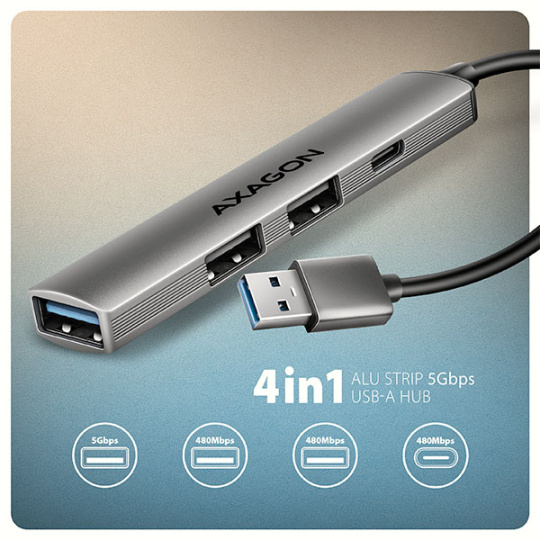 AXAGON HUE-STA, 4x USB ALU STRIP hub, 1x USB-A 5Gbps, 2x USB-A & 1x USB-C 480Mbps, kabel USB-A 12cm