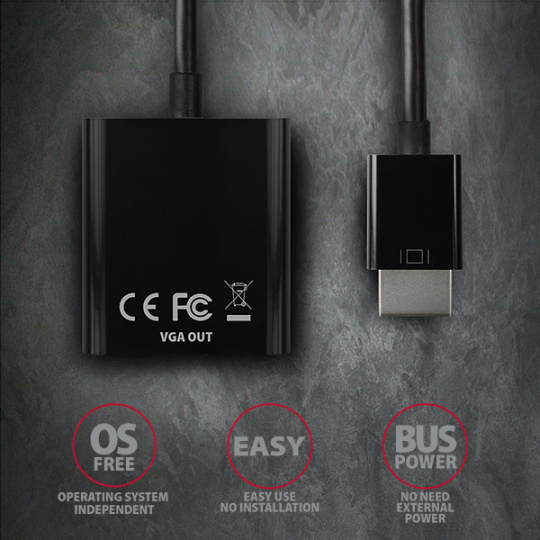 Hardwarový převodník bez potřeby jakékoliv instalace či nastavování zajistí přenos obrazu až do rozlišení 1920x1200 (WUXGA) při obnovovací frekvenci 60Hz. Inovované provedení elektroniky adaptéru zajišťuje vysoce kvalitní čistý a ostrý obraz.