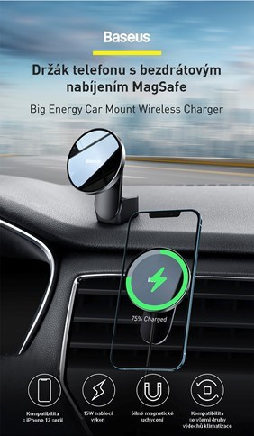 Baseus Big Energy držák s bezdrátovým nabíjením 15W černá (kompatibilní s Apple iPhone 12 Series)