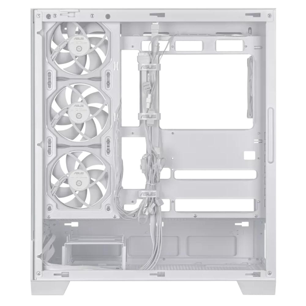 Skříň ASUS A31 PLUS ATX nabízí podporu základních desek se skrytými konektory, 360mm chladiče a 380mm grafické karty, černé nebo bílé barevné provedení, čtyři předinstalované ventilátory ARGB a čistý management kabelů.