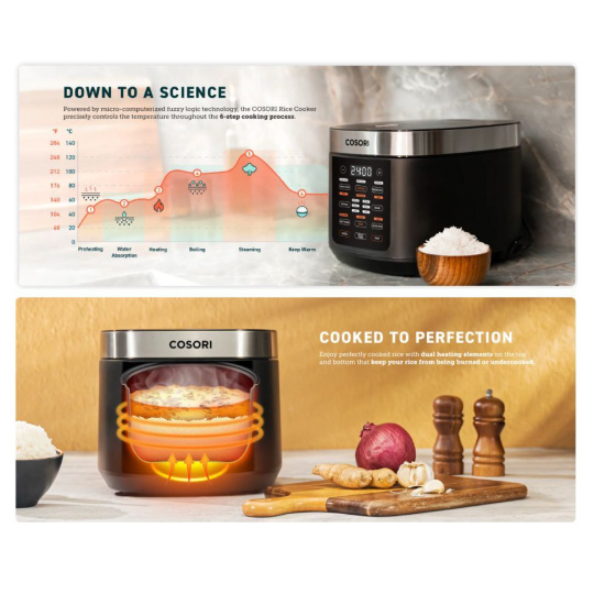 Multifunkční rýžovar Cosori nabízí různé možnosti přípravy pokrmů: různé druhy a úrovně přípravy rýže (podle chuti - standardní, měkká nebo tvrdší), kaše a jiné obiloviny, ale také další funkce jako režim pomalého vaření, vaření v páře, dušení, režim udržování teploty, odložené vaření, pečení nebo režim rychlé přípravy rýže.